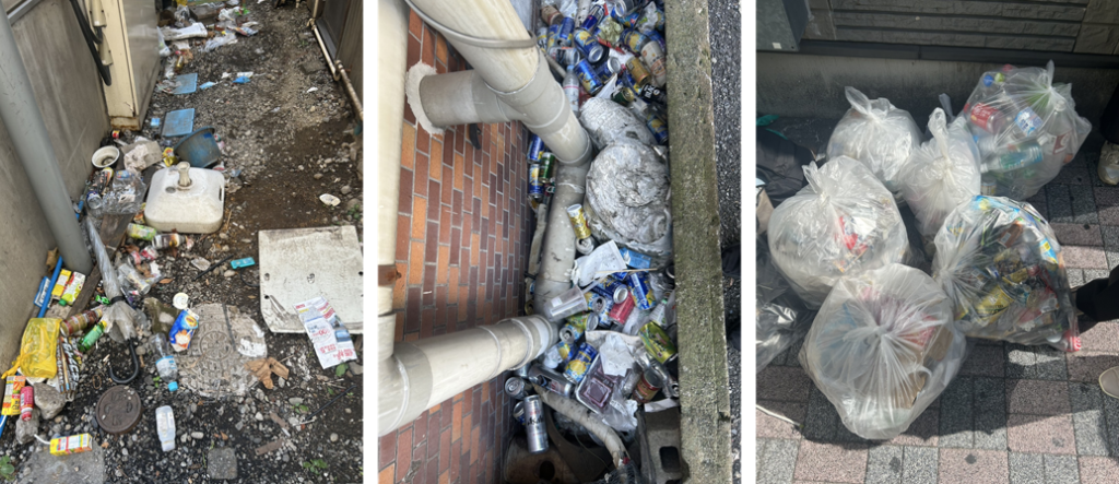 一昨日の台風の影響で、道路の端には風雨で押し流されたゴミも多く見られました。さらに、建物の間や人目につきにくい場所には、ペットボトルや空き缶が大量に放置されており、「これは確実に人の手によるポイ捨てだね」とため息混じりの声も。しかし、参加者は互いに声を掛け合いながら、すっきりと取り除いていきました。